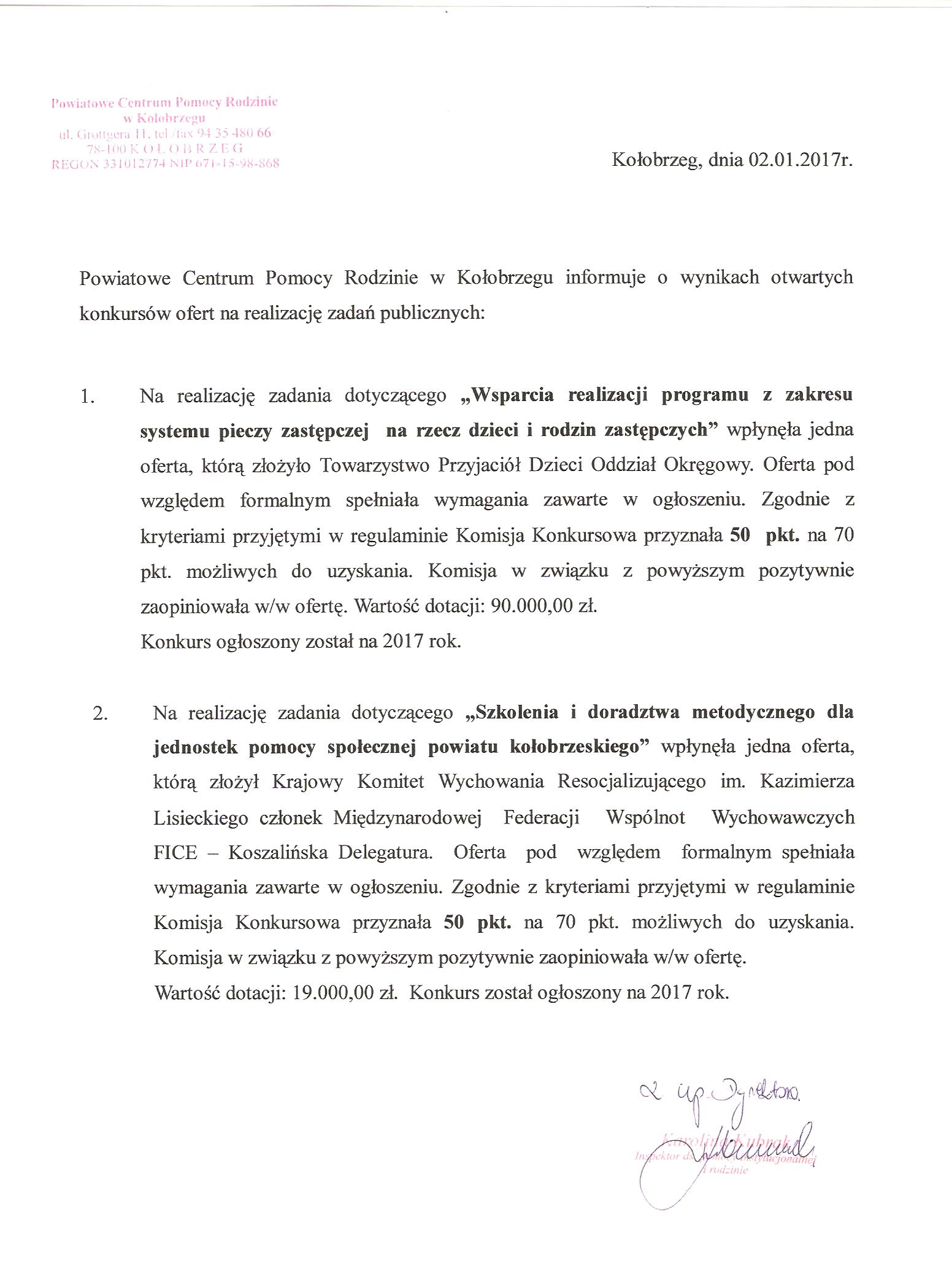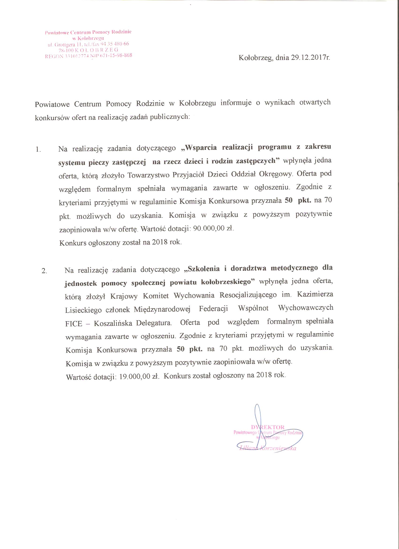 Na realizację zadania dotyczącego „Szkolenie i doradztwo metodyczne dla jednostek pomocy społecznej powiatu kołobrzeskiego” wpłynęła jedna oferta, którą złożyło Towarzystwo Przyjaciół Dzieci Oddział Okręgowy w Koszalinie. Oferta pod względem formalnym spełniała wymagania zawarte w ogłoszeniu. Zgodnie z kryteriami przyjętymi w regulaminie Komisja Konkursowa przyznała 65 pkt. na 70 pkt. możliwych do uzyskania.